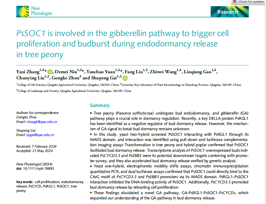 近日,William威廉英国盖树鹏、园林与林学院周功克团队合作在New Phytologist上发表了题为“PsSOC1 is involved in the gibberellin pathway to trigger cell proliferation and budburst during endodormancy release in tree peony”的研究论文。该研究发现了一种GA信号的新途径,解析了牡丹PsSOC1作为GA信号的重要组分通过重启细胞周期调控芽休眠解除的分子机制。