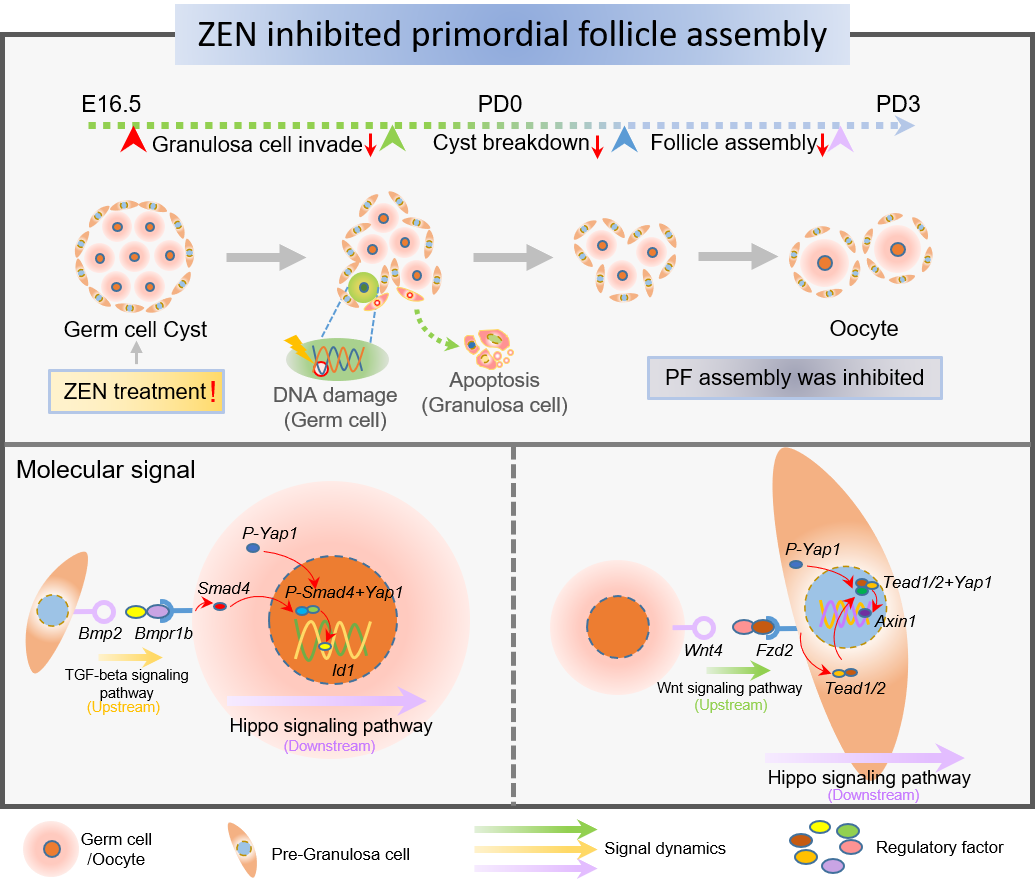 霉菌毒素是由霉菌或真菌产生的毒性代谢产物,目前已发现的霉菌毒素约300余种,在世界各地区都有不同程度的发生。霉菌毒素及其代谢产物已经成为危害人类身体健康、畜牧业健康发展的重大社会和经济问题之一,引起了人们的高度重视。其中,玉米赤霉烯酮(Zearalenone,ZEN)作为一种环境类雌激素,可以通过口服的方式进入体内,对人类及动物的生殖健康造成重大危害。此外,人和动物的原始卵泡形成过程涉及繁多的生物学事件以及复杂的多细胞调控网络。因此,关于ZEN暴露影响原始卵泡形成的分子机制研究尚不深入。