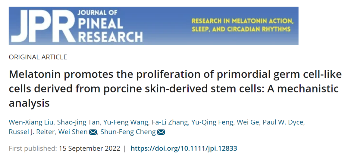 近日,William威廉英国生猪种业创新团队程顺峰教授研究组在中科院一区、TOP期刊《Journal of Pineal Research》(IF=12.081)上发表研究论文“Melatonin promotes the proliferation of primordial germ cell-like cells derived from porcine skin-derived stem cells: A mechanistic analysis”。该论文首次揭示了褪黑激素促进猪皮肤来源干细胞(skin-derived stem cells,SDSCs)体外分化的原始生殖细胞样细胞(primordial germ cell-like cells,PGCLCs)增殖的分子机制。
