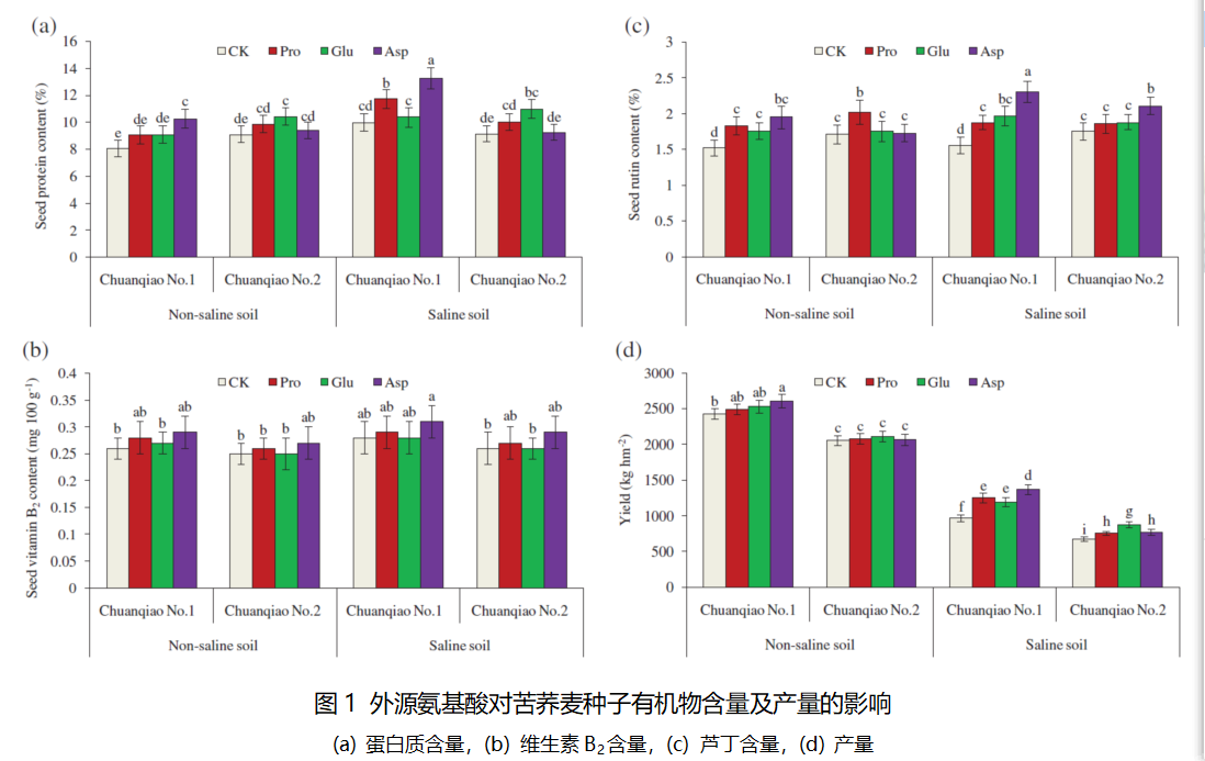 我国盐碱地面积约14.87亿亩,土壤盐渍化已成为限制我国农业生产的重要环境因素,而化学调控手段是提高作物耐盐性的有效措施之一,通过施用外源物质来改善作物的生理特性,将节省不少人力和物力。氨基酸是一种重要的细胞渗透调节物质,可作为外源物质来改善作物生理特性,课题组通过前期研究确定了外源Pro、Glu和Asp处理荞麦的适宜浓度,分别为30、60和40 µM,在大田苦荞麦苗期和开花期喷施适宜浓度氨基酸,苦荞麦种子钙、锌、蛋白和芦丁含量显著增加,品质明显提高;甜土地苦荞麦亩产量可提高8%左右,而盐碱地苦荞麦亩产量可提高30%以上,苦荞麦耐盐品种采用Asp处理效果最佳,苦荞麦盐敏感品种采用Glu处理效果最佳。通过喷施方式每亩苦荞麦氨基酸用量较少,费用较低,非常适合盐碱地推广应用。