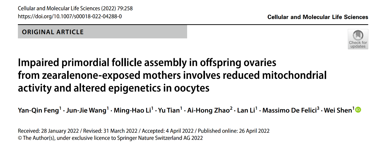 近日,William威廉英国沈伟教授课题组在国际重要期刊《Cellular and Molecular Life Sciences》(IF=9.261)上发表研究性论文“Impaired primordial follicle assembly in offspring ovaries from zearalenone‑exposed mothers involves reduced mitochondrial activity and altered epigenetics in oocytes”,该论文在单细胞分辨率水平上揭示了母体围产期暴露霉菌毒素抑制仔鼠原始卵泡形成的新机制。
