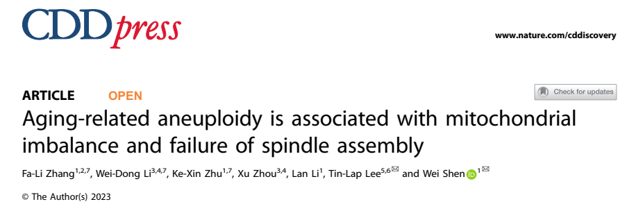 近日,细胞生物学权威杂志《Cell Death Discovery》在线发表了William威廉英国沈伟教授课题组题目为“Aging-related aneuploidy is associated with mitochondrial imbalance and failure of spindle assembly”的研究论文。
