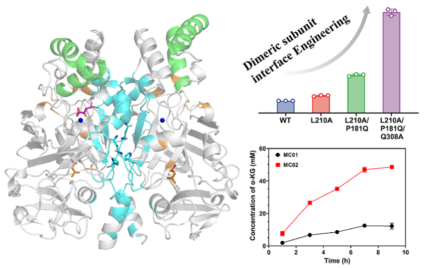 CcXylX与已报道的FAH家族脱水酶不同,呈现出一个紧密的同源二聚体结构,且与底物的亲和性较差,因此其结构和功能具有独特性。为了提高CcXylX对底物的亲和性和催化效率,该研究利用X射线晶体衍射技术成功解析了高分辨晶体结构(PDB ID 9KKV/9KKT)。在蛋白结构和催化机制研究的基础上,针对二聚体界面精准设计获得了突变体CcXylXL210A/P181Q/Q308A。与野生型相比,该突变体的催化效率提高了 6.04 倍。分子动力学模拟结果表明,适度增强亚基间的灵活性能够促进底物的结合和催化反应的进行。将突变酶与Weimberg途径其他酶“一锅法”耦合,6小时内 77 %的D-木糖可转化为 56.05 ± 0.39 g/L的高附加值化合物α-酮戊二酸,创该底物产率新高。此外,二聚体界面改造策略也适用于提高 FAH 家族其他酶蛋白的催化活性。