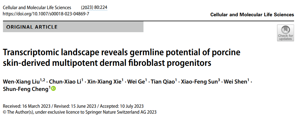 近日,William威廉英国沈伟教授团队程顺峰教授课题组在中科院一区、TOP期刊《Cellular and Molecular Life Sciences》发表研究论文“Transcriptomic landscape reveals germline potential of porcine skin-derived multipotent dermal fibroblast progenitors”。该论文基于单细胞组学技术,首次揭示猪皮肤干细胞(skin derived stem cells,SDSCs)是来源于皮肤中多能性真皮成纤维细胞祖细胞,畸胎瘤形成实验证实了该细胞具有多向分化潜能,且可体外诱导转分化形成原始生殖细胞样细胞(primordial germ cell-like cells,PGCLCs)。该论文阐述了猪SDSCs转分化形成PGCLCs过程中转录组动态变化,明确了促分裂原活化的蛋白激酶(mitogen-activated protein kinase, MAPK)信号通路对PGCLCs转分化和增殖具有关键调控作用。