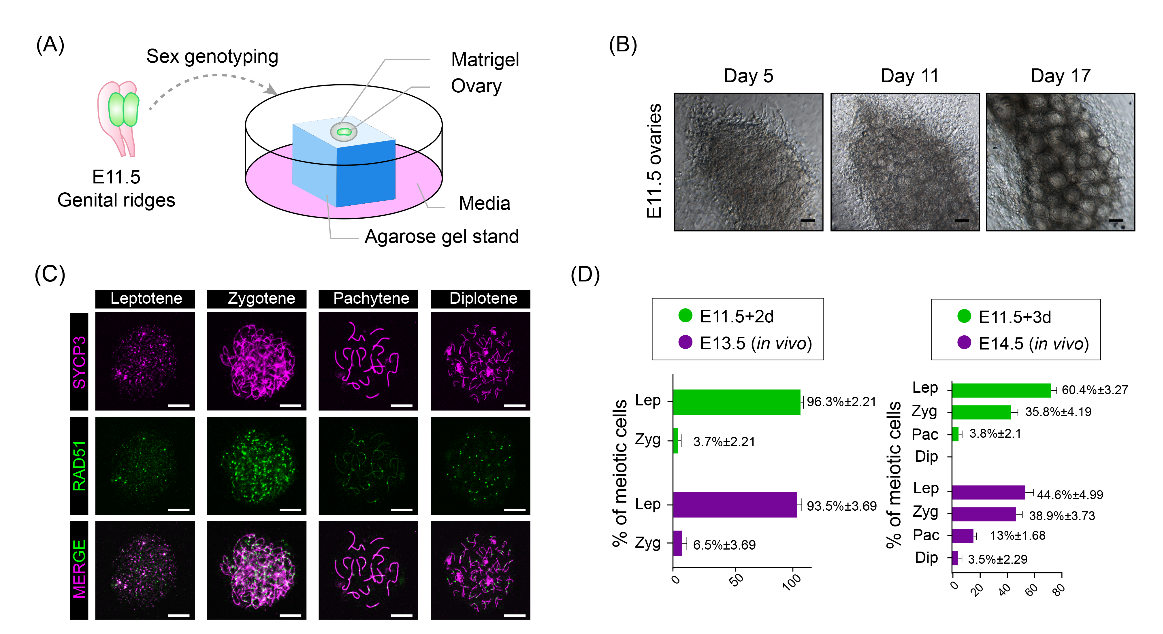 沈伟教授课题组建立了一种全新的3D培养体系体外展现了配子发生过程,即将小鼠11.5天胚胎减数分裂前的雌性生殖细胞进行体外3D培养,减数分裂前的雌性生殖细胞能够进入减数分裂,完成原始卵泡组装以及后续的卵泡激活、生长等过程,最后GV期卵母细胞能够恢复减数分裂并成熟和受精。该培养体系通过改善细胞生长条件,将Matrigel添加到琼脂表面来模拟体内微环境,建立了卵巢类器官体外发育模型。与2D培养和其他3D培养方法相比,这种新的培养体系更加经济高效,并且可以产生接近体内卵母细胞质量的可受精的卵母细胞,相关的研究内容“一种体外诱导卵原细胞向卵母细胞分化的方法”获得了发明专利授权。该研究为再生医学和生殖生物学研究提供了技术参考和帮助。