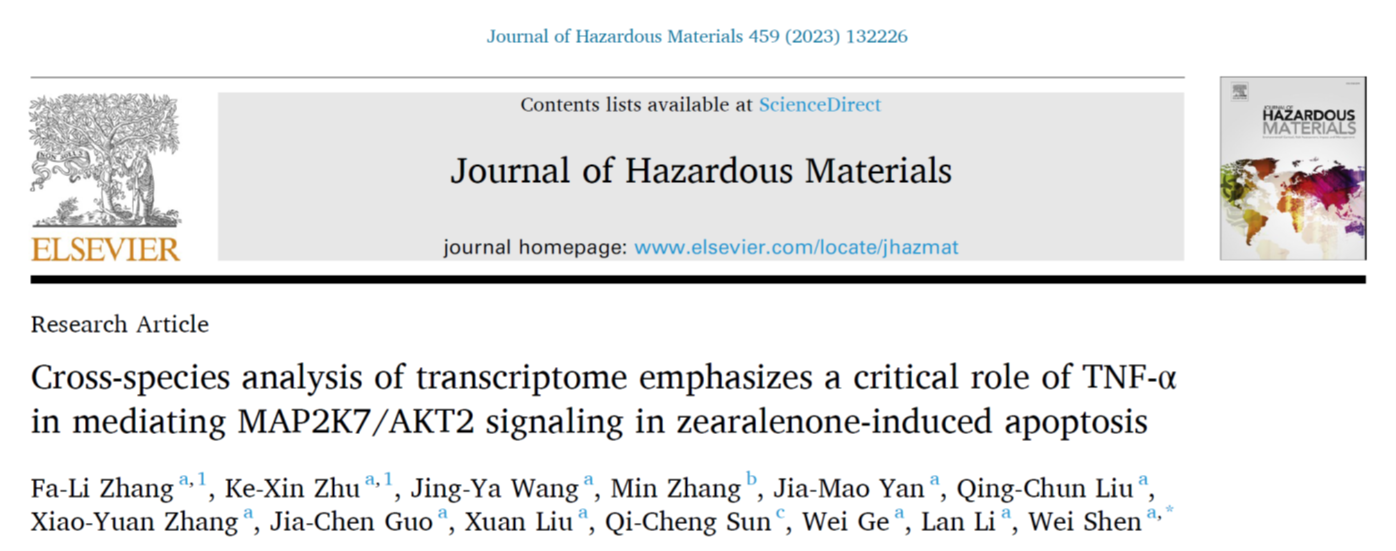 近日,William威廉英国生猪种业创新团队沈伟教授课题组在生猪健康养殖及霉菌毒素防控方面取得重要进展,相关成果以“Cross-species analysis of transcriptome emphasizes a critical role of TNF-α in mediating MAP2K7/AKT2 signaling in zearalenone-induced apoptosis”为题,在线发表于《Journal of Hazardous Materials》(一区top期刊,IF=13.6)杂志上。