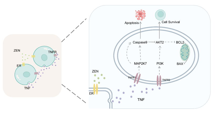 沈伟教授课题组通过跨物种的比较转录组分析、加权基因共表达网络(WGCNA)分析、功能富集分析等生信技术手段,发现ZEN暴露猪颗粒细胞和小鼠颗粒细胞后,肿瘤坏死因子-α(TNF-α)介导的丝裂原活化蛋白激酶激酶7(MAP2K7)/ AKT丝氨酸/苏氨酸激酶2 (AKT2)轴出现紊乱,即TNF-α介导的AKT2/MAP2K7轴是ZEN触发卵巢颗粒细胞凋亡的关键分子信号途径。该研究通过颗粒细胞体外RNA干扰和基因敲除小鼠模型等实验证实,TNF-α 介导的 MAP2K7/AKT2 是 ZEN 诱导细胞凋亡的指导信号。卵巢组织的单细胞转录组分析也显示,ZEN暴露可以诱导后代TNF信号通路发生变化。此外,通过改变TNF-α的表达水平可缓解ZEN的毒害作用。该研究工作深入解析了ZEN触发卵巢颗粒细胞凋亡的分子信号机制,研究结果为减轻霉菌毒素污染造成的机体毒害提供新的靶点和理论基础。