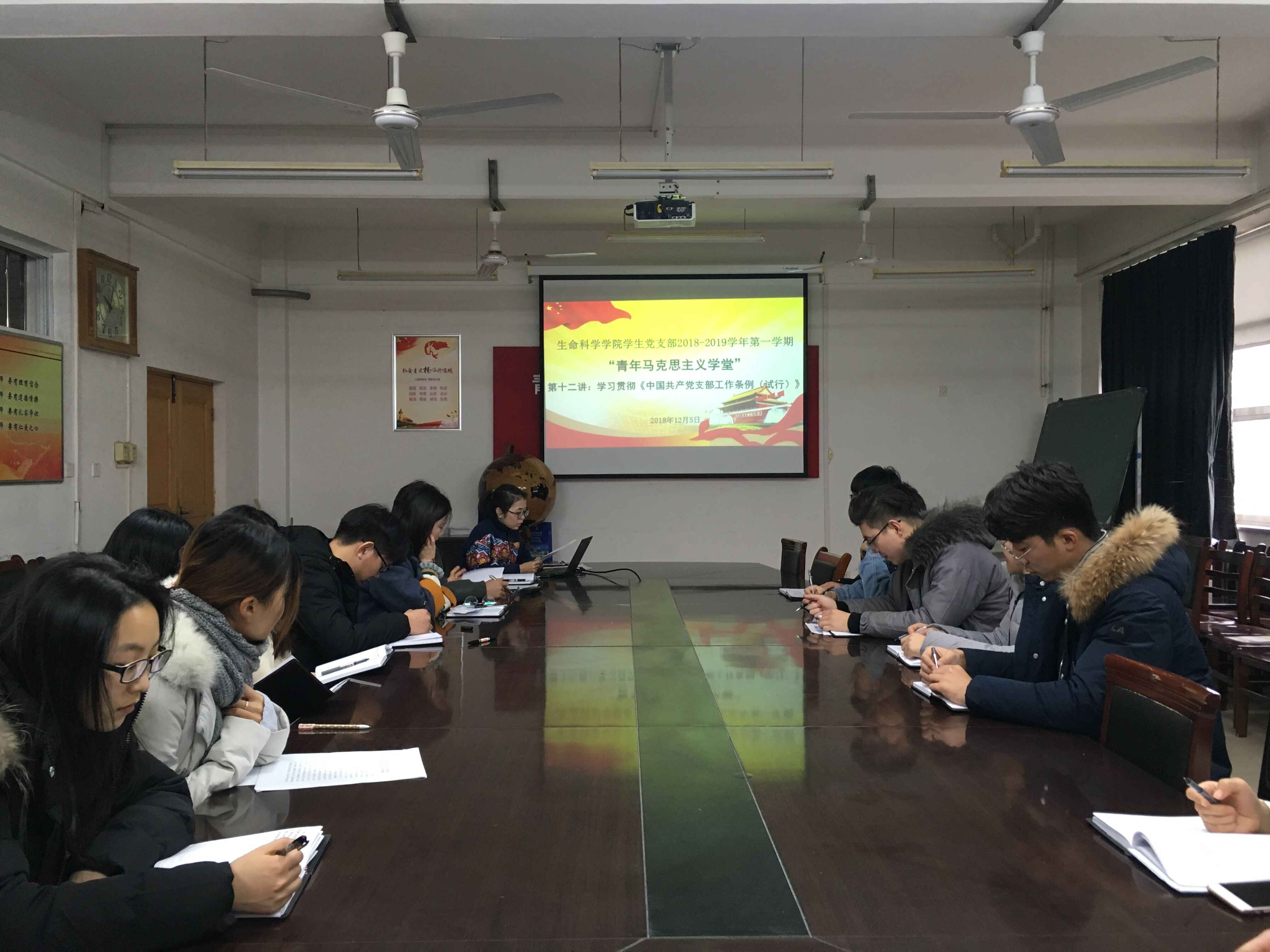 12月5日,我院学生党支部在生物楼开展2018-2019学年第一学期 “青年马克思主义学堂”第十二讲——学习贯彻《中国共产党支部工作条例(试行)》,全体学生党员参加了本次学习。 会上,支部的组织委员许菲菲带领全体党员共同学习了《中国共产党支部工作条例(试行)》,了解了党支部工作的5大原则、8项基本任务,如何加强党支部委员会建设,党支部应开展哪些组织生活,其工作机制及如何保障、落实等,随后邢孟阁同志带领大家学习了“山东省优秀共产党员”许步忠同志的先进事迹,学习他信念坚定、忠诚可靠的政治品格,勇挑重担、事不避难的担当精神,心系群众、为民奉公的公仆情怀,朴实无华、严于律己的道德情操。 参与本次学习的党员表示,在学习了党支部工作条例后对党支部工作机制、原则等都有了更深刻全面的认识。对于许步忠同志先进事迹的学习更是鞭策了大家,大家均表示日后的工作学习中定会以先进典型为榜样,坚定理想信念,提高政治站位,践行党的宗旨,弘扬担当精神,脚踏实地工作、学习,不断努力像榜样看齐。